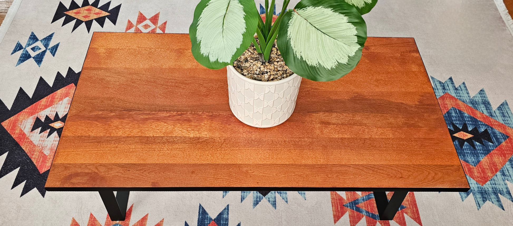 Solid Birch Coffee Table with Black Metal Trapezoid Legs – Natural Dark Honey Finish, 36"x20"