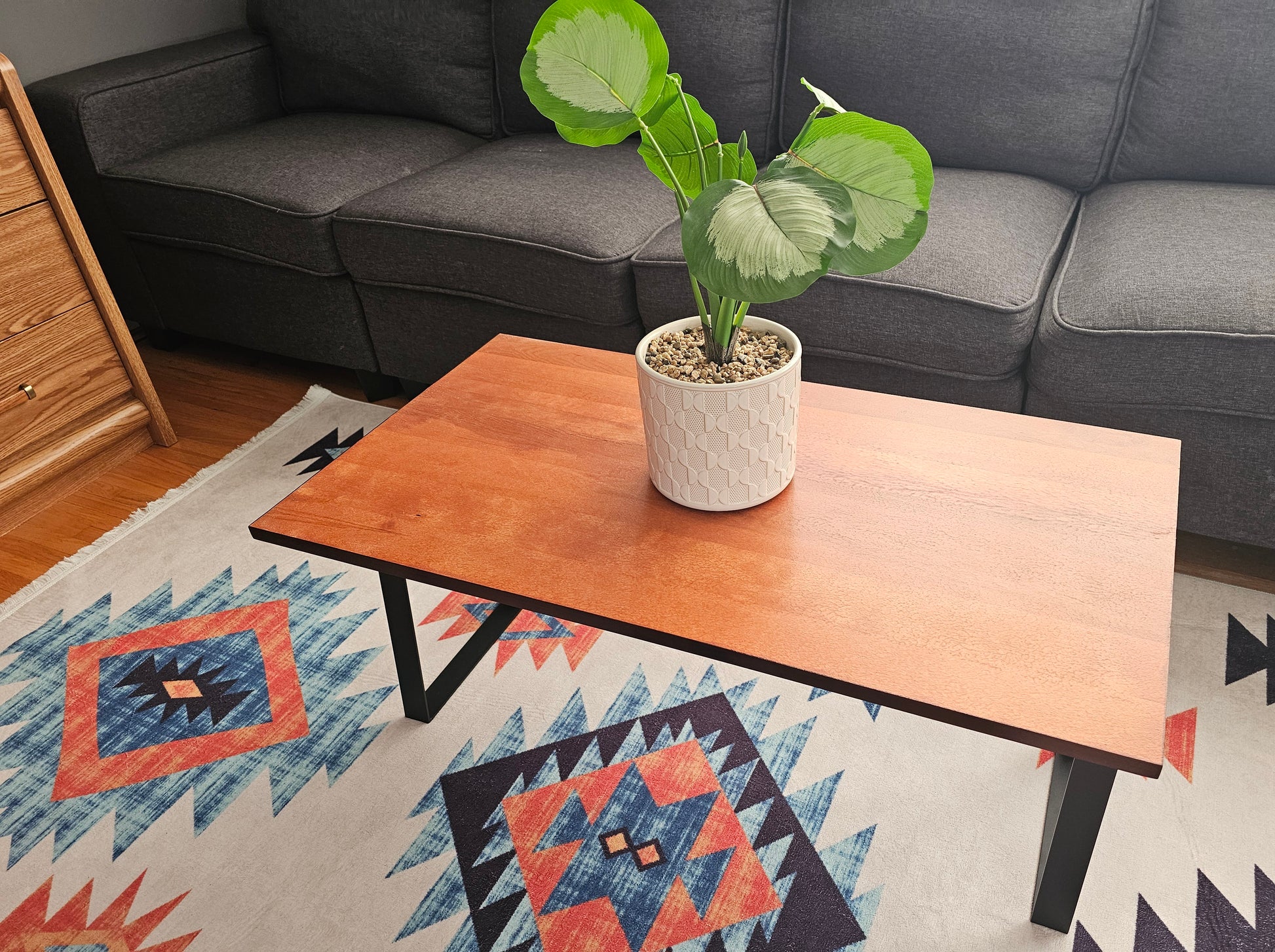 ​Bring modern industrial style to your home with this handcrafted coffee table. Featuring a solid Birch wood top with a stunning "Light Walnut and Honey" finish, this table contrasts the warmth of natural wood with the cool edge of black metal trapezoid legs.