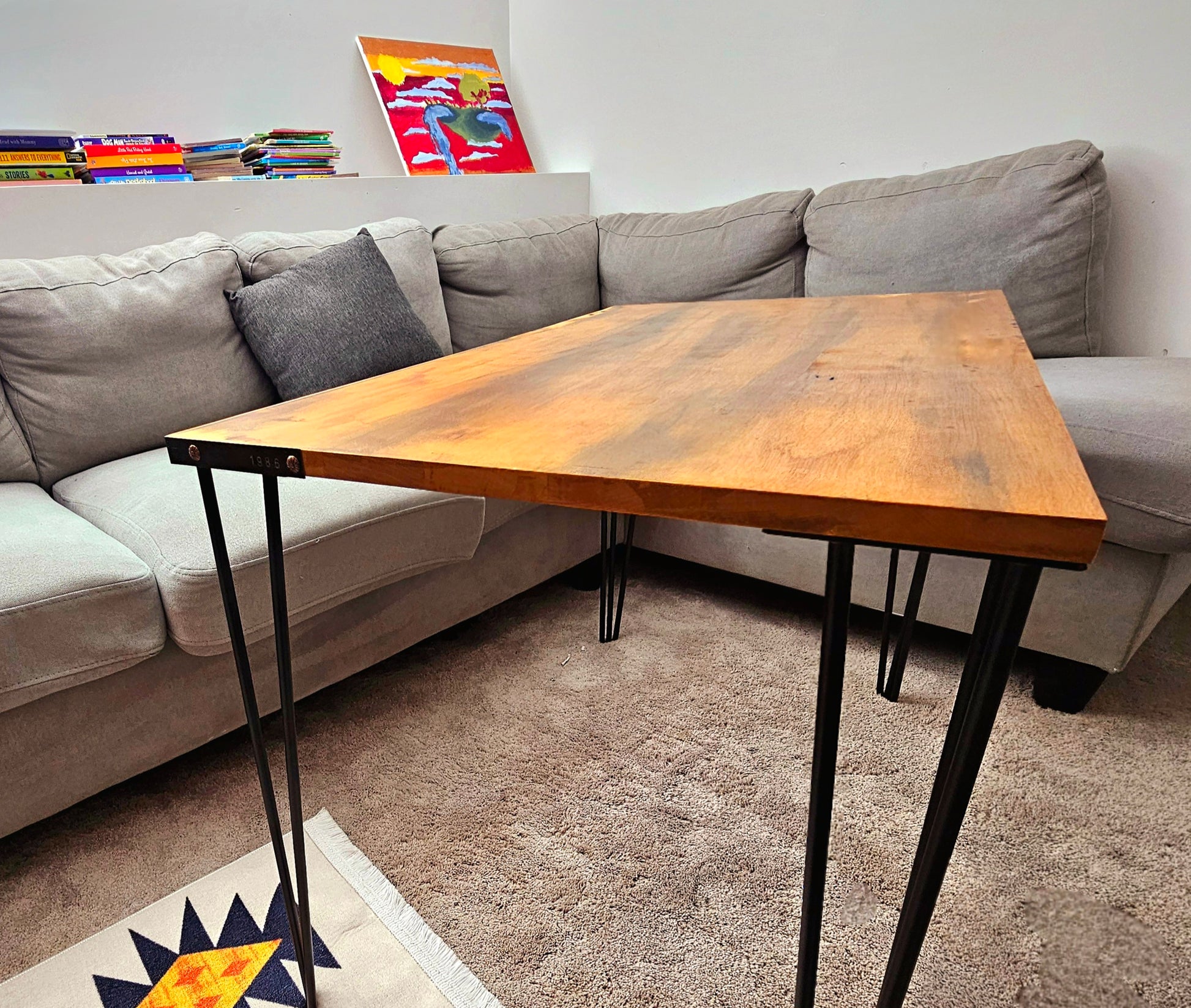 The tabletop is crafted from high-quality, solid birch wood, showcasing the natural grain and warm tones of the wood. Its smooth, durable finish highlights the wood's inherent beauty and provides a lasting surface for everyday use. The sleek, 24-inch hairpin legs, finished with a durable black powder coat, provide a striking contrast to the natural wood and add a touch of modern elegance.