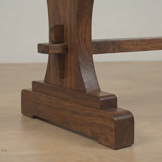 The Heritage Trestle Base brings the robust, architectural beauty of the Arts & Crafts movement to your living room. The focal point of this design is the functional Keyed Tenon joinery—a visible wooden wedge that passes through the central beam, locking the frame together without the need for complex hardware.